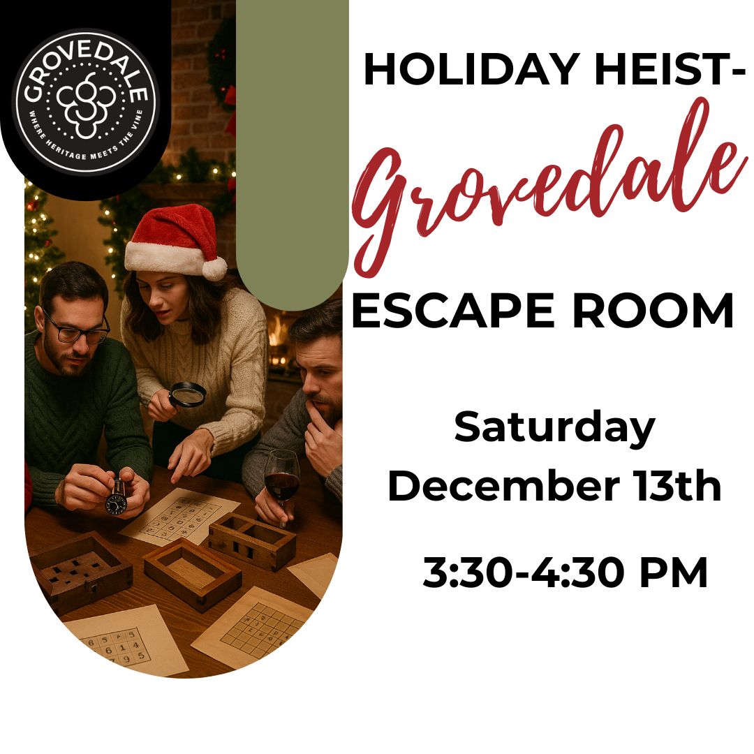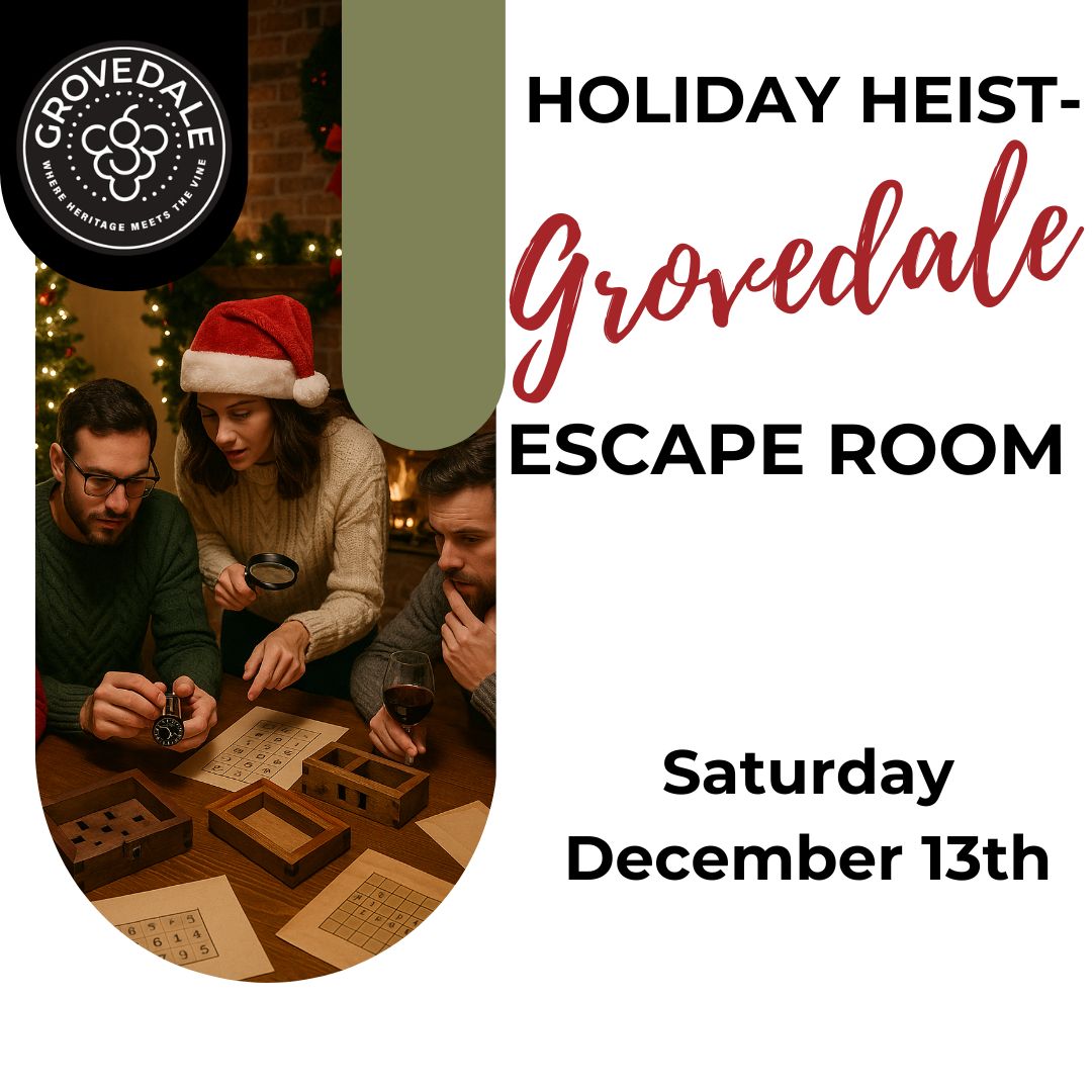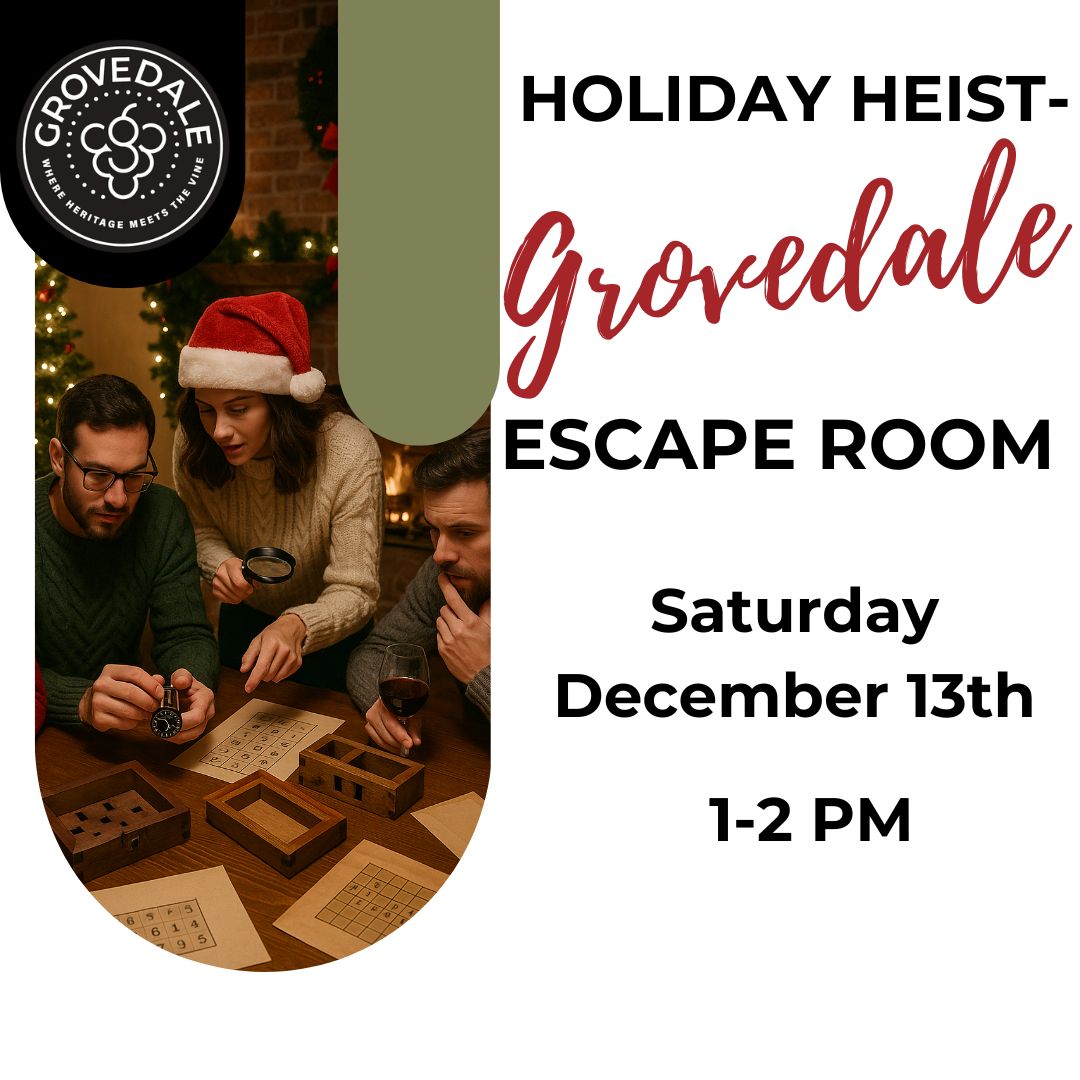 Step into the mystery this holiday season at Grovedale Winery’s Holiday Heist Escape Room! Join friends, family, or fellow adventurers for a one-of-a-kind experience inside the historic Red House. Work together in groups of up to 12 to uncover clues, solve puzzles, and race against the clock to escape within 60 minutes.